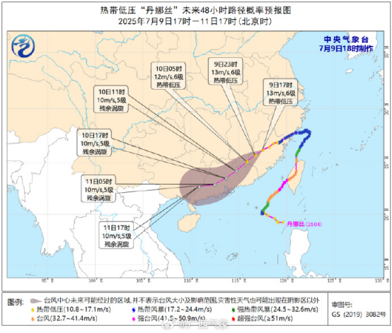 7月9日9时,“丹娜丝”在福建宁德屏南县境内减弱为热带低压,其残余环流未来将长时间维持。17时,“丹娜丝”位于福建省三明市三元区境内,强度逐渐减弱。