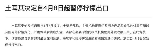 从去年开始,不只是四川安岳,全球其他的几个主要柠檬产区如阿根廷、土耳其、意大利也都遭遇了极端天气。今年,土耳其突然宣布从4月8日起暂停柠檬出口,主要原因就是霜冻灾害引起了柠檬大规模减产。