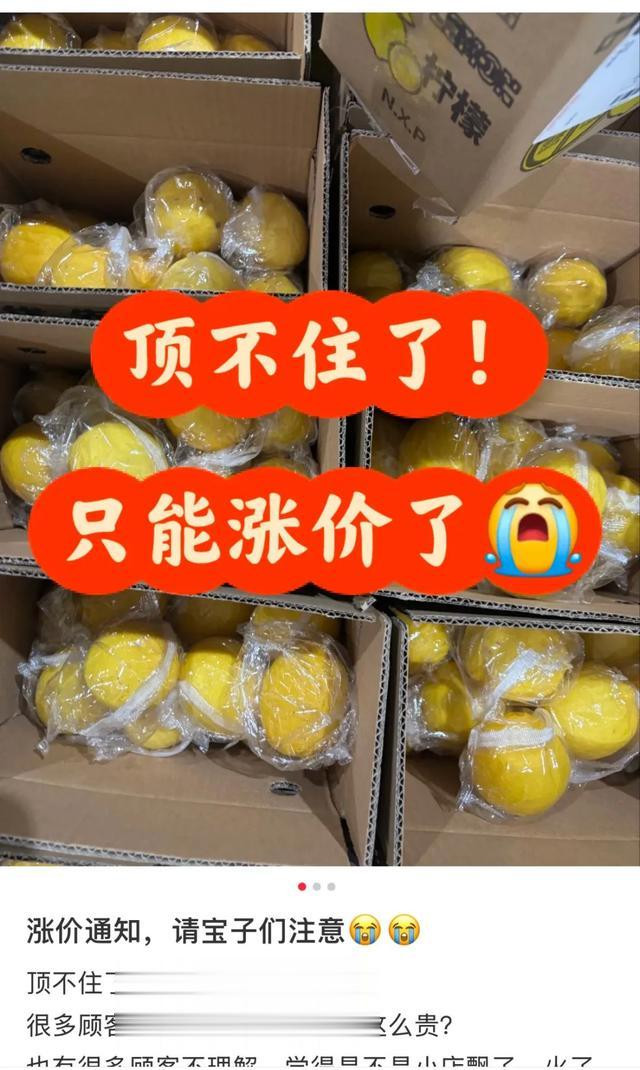 早在一个月前,店铺的老板便在社交媒体发布消息,“顶不住了,只能涨价”。老顾客们发现,柠檬几天就能涨出一个新的价格。去年9.9元能买3斤中果,到了今年4月份,9.9元只能买一斤,5月份一斤柠檬的价格已经涨到11.8元,还供不应求。相比起去年同期,涨幅达到3倍。有顾客表示自己一直都有日常喝柠檬水的习惯,但是“从来没买过这么贵的柠檬”。