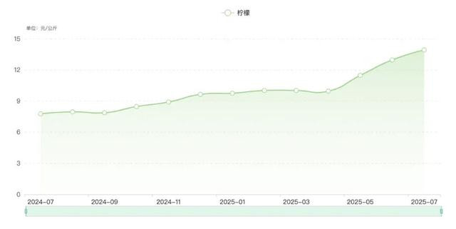 全国农产品批发市场价格信息系统显示,全国黄柠檬价格是从5月开始上涨的。年初以来,柠檬批发价一直维持在9.5元/公斤左右,直到6月底,价格达到了14.02元/公斤。